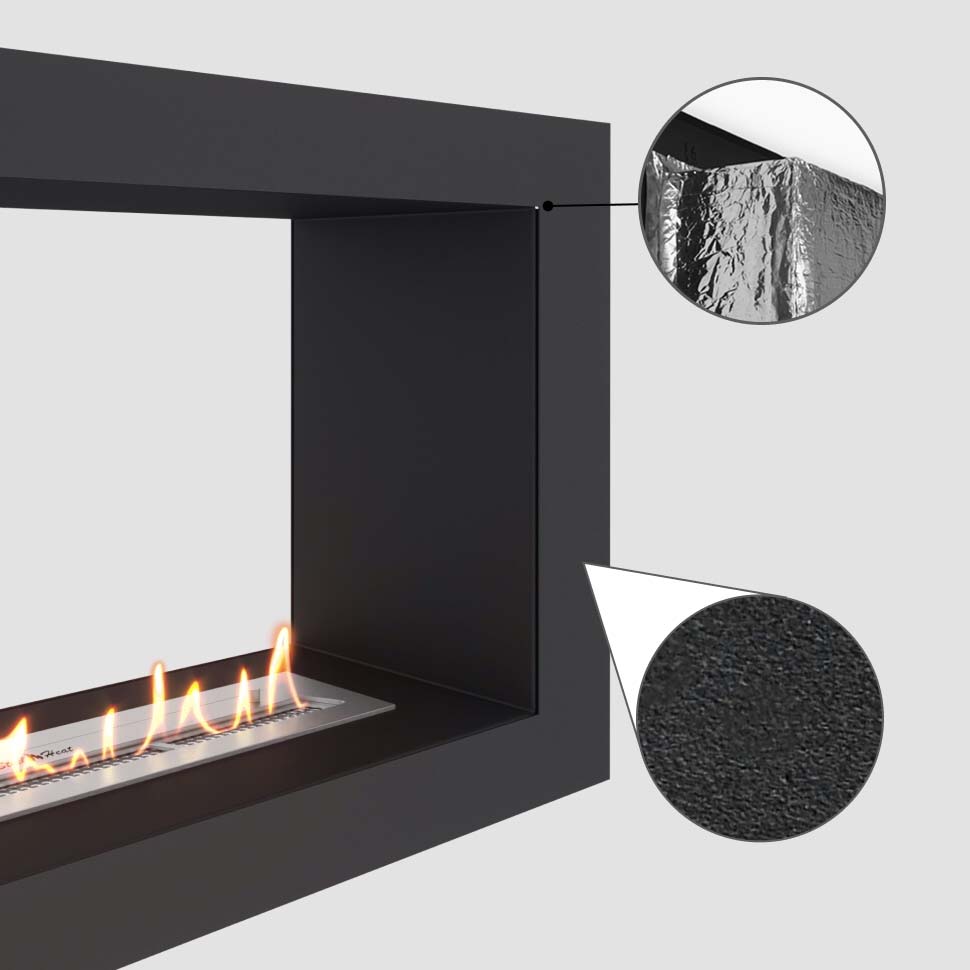 Очаг биокамина покрыт огнеупорной порошковой краской. При необходимости рекомендуем покрыть обратную часть очага теплоизоляцией!